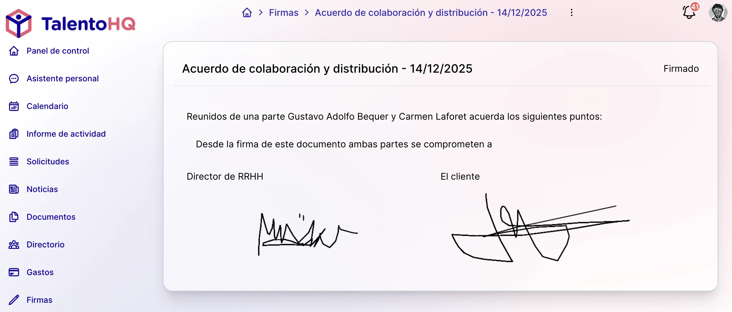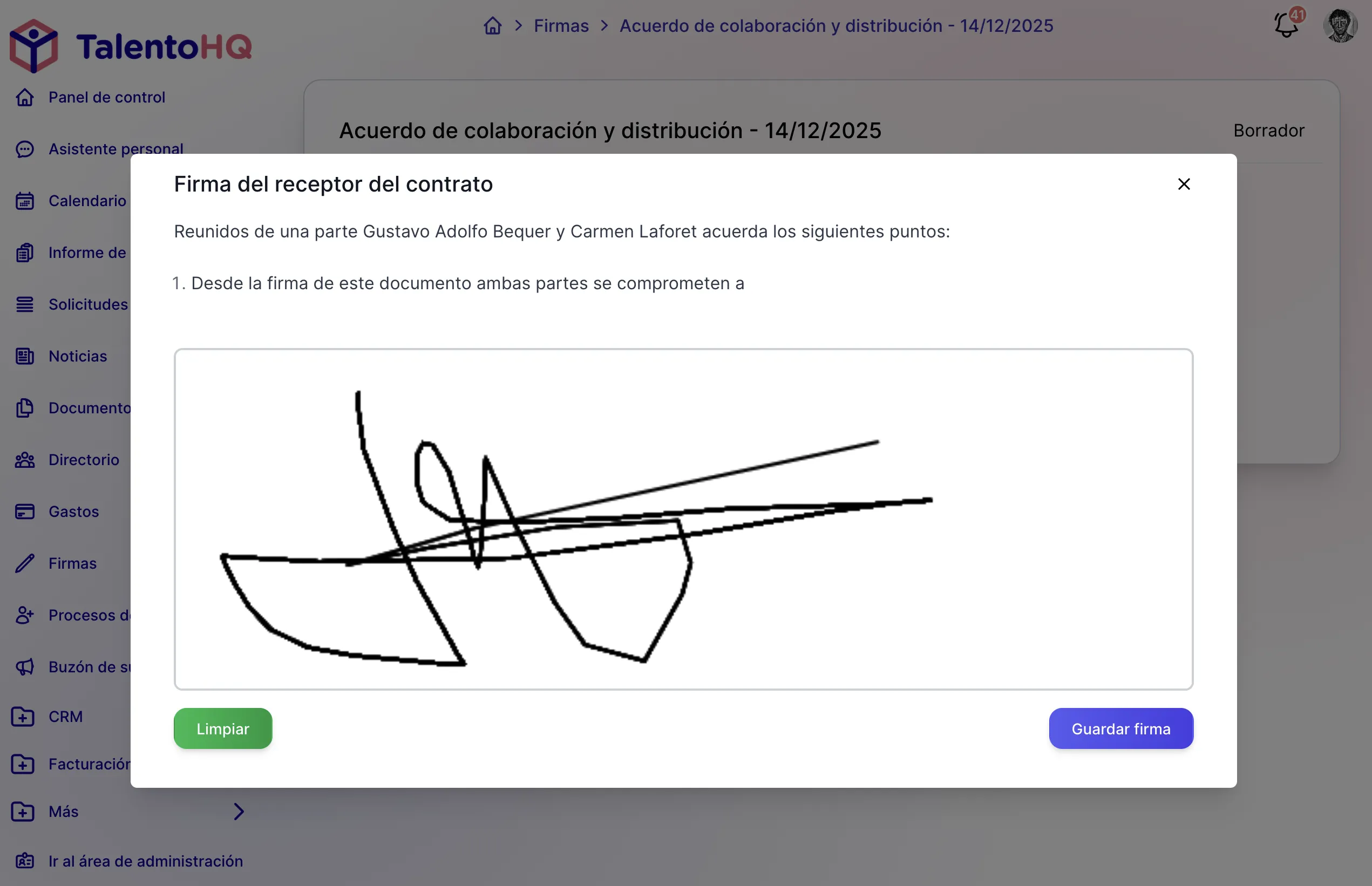 Aquí es donde el sistema realmente brilla. En lugar de gestionar contratos como un proceso separado, TalentoHQ integra la firma de documentos directamente en el flujo de incorporación de nuevos empleados.