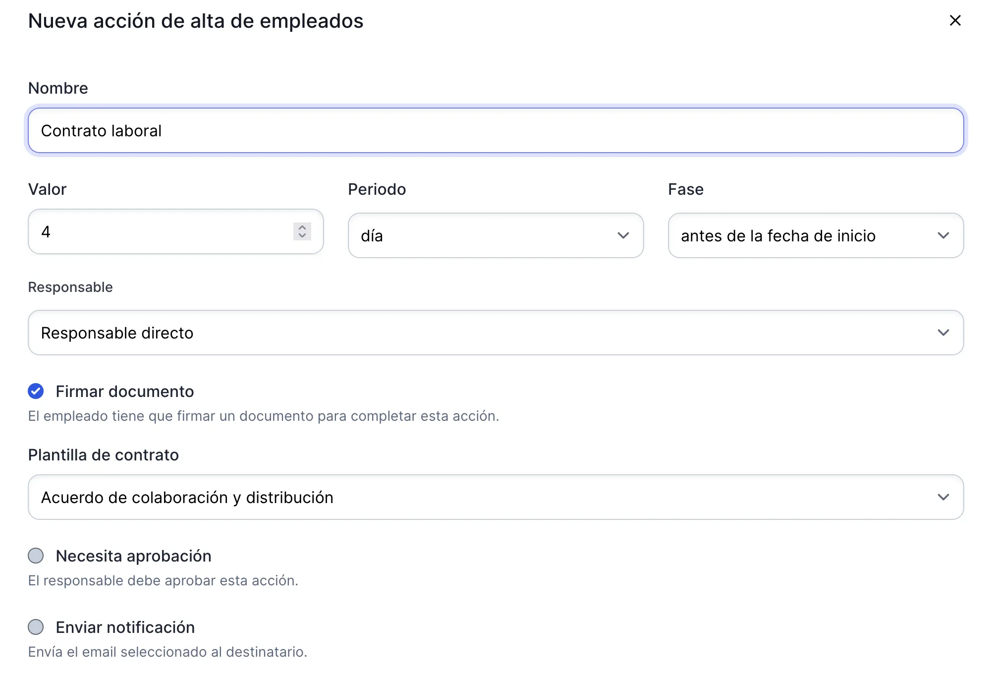 Cuando creas un proceso de onboarding para un nuevo empleado, puedes incluir la firma del contrato como uno de los pasos: